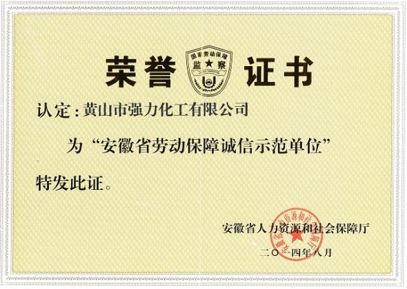 為表彰先進(jìn),樹立典型,在全社會(huì)營(yíng)造用人單位自我規(guī)范、自我約束、誠(chéng)實(shí)守信的良好氛圍,不斷強(qiáng)化用人單位勞動(dòng)保障管理。黃山市強(qiáng)力化工有限公司在簽訂履行勞動(dòng)合同、繳納社會(huì)保險(xiǎn)費(fèi)、規(guī)范用工行為等方面取得顯著成績(jī),被授予“安徽省勞動(dòng)保障誠(chéng)信示范單位”稱號(hào)。