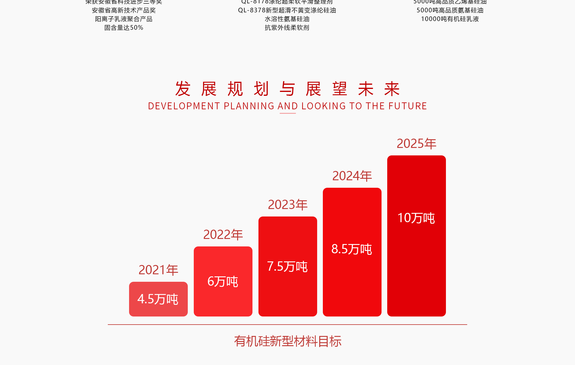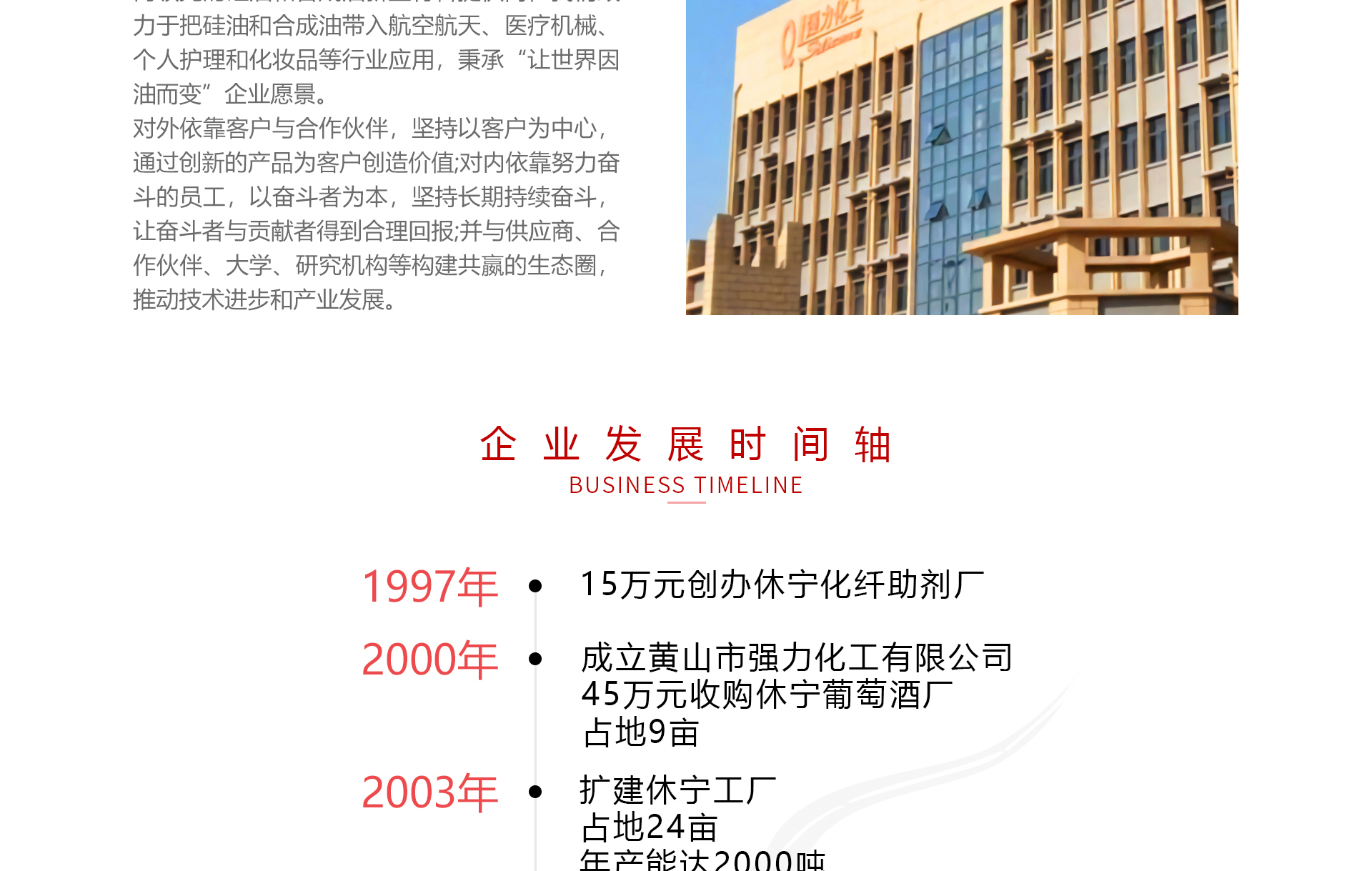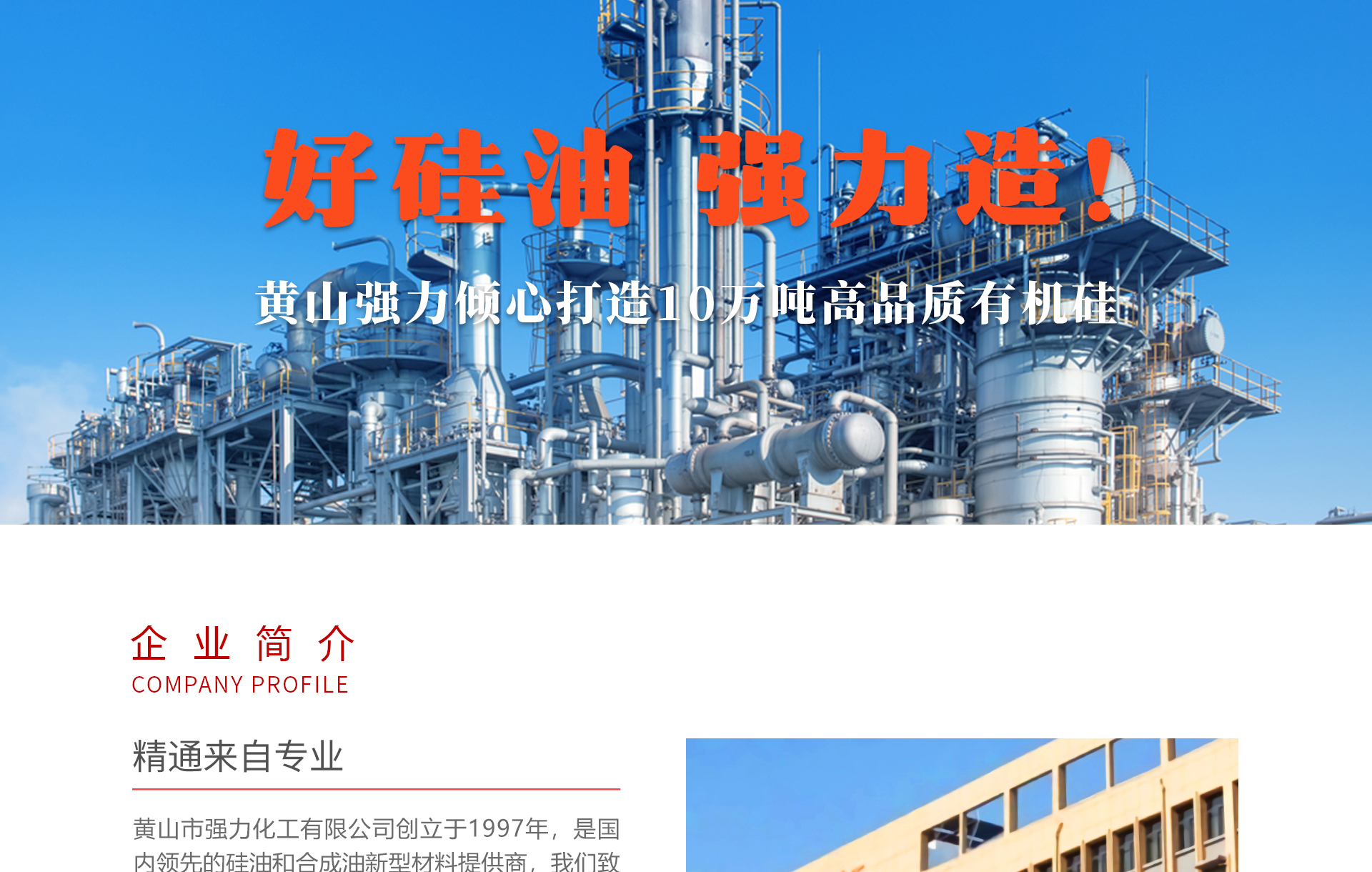 黃山強力化工有限公司成立于1997年,由葉光華先生創(chuàng)辦,是一家以硅樹脂聚酯纖維為一體,解決了碳纖維生產(chǎn)中存在的問題的研發(fā)生產(chǎn)型企業(yè)。公司坐落于安徽省黃山市歙縣循環(huán)經(jīng)濟園區(qū)緯一路23號,占地面積30000平方米,擁有優(yōu)秀的研發(fā)團隊,先進的生產(chǎn)設(shè)備以及敬業(yè)專業(yè)的員工,是質(zhì)量與發(fā)展的保證!企業(yè)主要焦點在21世紀是硅油聚酯短纖維和硅酮液體,主要以硅油、二甲基硅油、聚二甲基硅氧烷、氨基硅油、乙烯基硅油、羥基硅油、硅乳液、D4、DMC、MM等產(chǎn)品專業(yè)生產(chǎn)加工,擁有完整、科學(xué)的質(zhì)量管理體系。公司致力于與創(chuàng)新與開拓,不斷升級生產(chǎn)線與時俱進,更新?lián)Q代,實現(xiàn)產(chǎn)能與質(zhì)量有質(zhì)的飛躍。目前擁有24H集散控制系統(tǒng)自動化生產(chǎn)系統(tǒng),二十條生產(chǎn)流水線,產(chǎn)能以硅油、乳液及配方生產(chǎn)能力超過30000噸/年。研發(fā)部門也積極開拓思路,研發(fā)出多種屬于自己的新產(chǎn)品:有機硅微乳液、乙烯基聚二甲基硅氧烷、含氫聚二甲基硅氧烷等。另外,公司也積極尋求多渠道多發(fā)展的可持續(xù)發(fā)展道路,維持線下業(yè)務(wù)銷售途徑不斷壯大的同時,也緊抓線上機遇與商機。從2020年起,正式成立了強力化工廣州辦事處,以融入珠三角經(jīng)濟圈謀求更好的發(fā)展,實現(xiàn)對內(nèi)銷售與對外貿(mào)易相結(jié)合更上一層樓。與此同時,辦事處也正式成立了電商部以應(yīng)對線上營銷推廣的專業(yè)渠道,通過阿里巴巴中文站與國際站,扎根國內(nèi)市場,不斷開拓海外市場,屆時已經(jīng)取得一定的成果;公司銷售占比有:64%國內(nèi)市場,海外份額占比36%。望公司同仁齊心協(xié)力更進一步,也期待各方客戶鼎力支持。