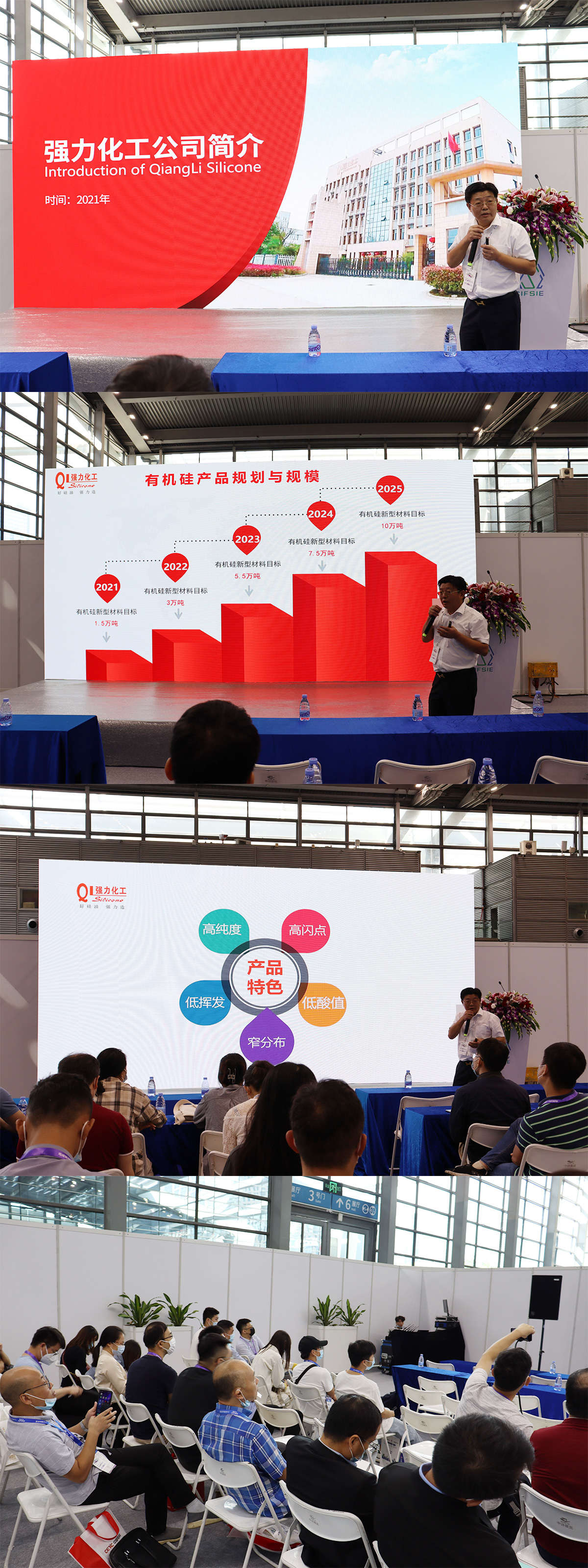 強(qiáng)力化工董事長葉光華發(fā)表重要演講,講述了當(dāng)今有機(jī)硅行業(yè)的現(xiàn)狀并對前景的展望,同時也分享我司高端產(chǎn)品高純度硅油制作工藝,全場干活滿滿,座無虛席。