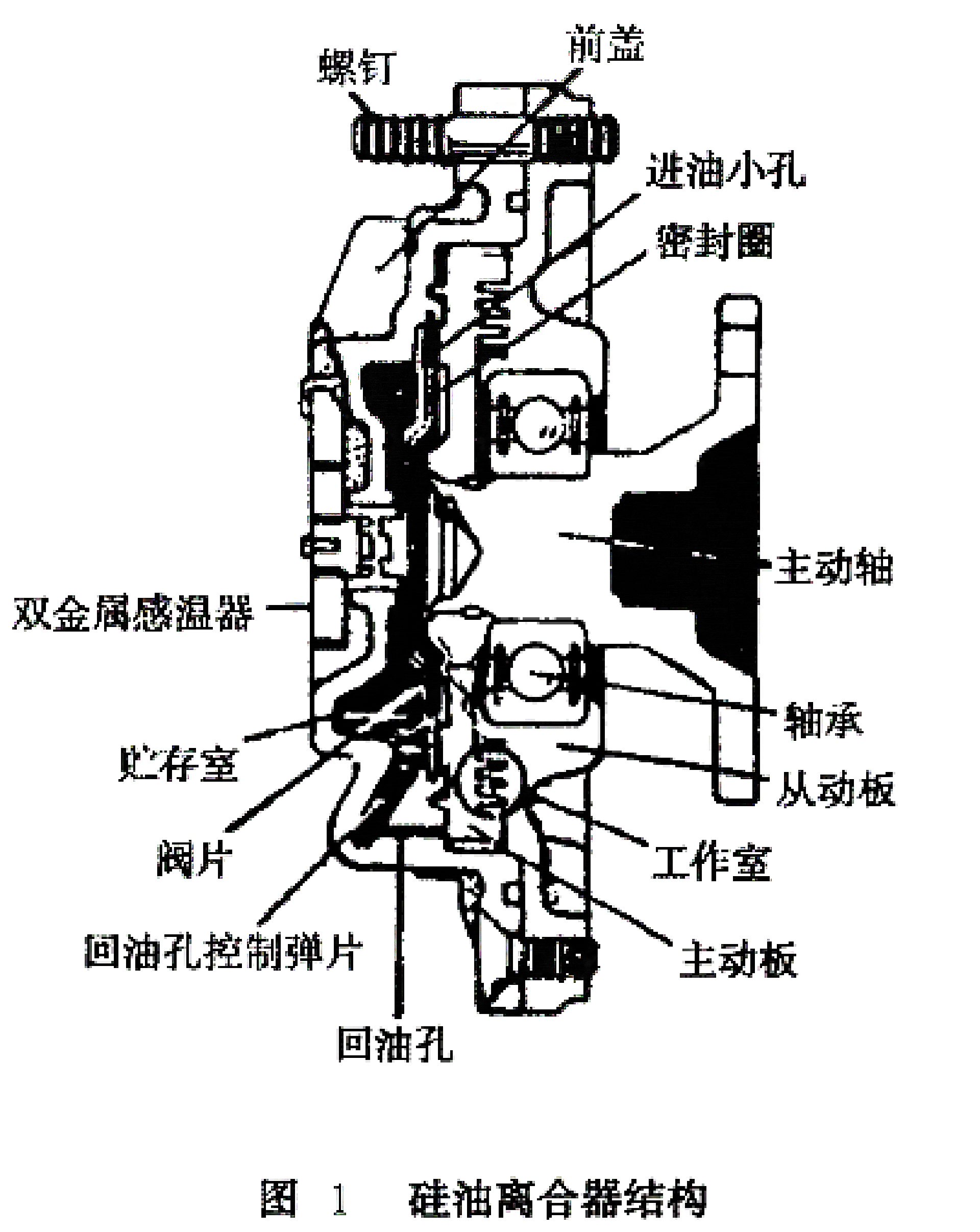 硅油風扇離合器,用硅油作為介質(zhì),利用硅油剪切粘力傳遞扭矩。風扇的轉(zhuǎn)速是考慮在使用條件最惡劣時保證發(fā)動機不過熱的條件下設(shè)計的,因此,在車輛通常行駛過程中,應該把風扇的轉(zhuǎn)速控制在適當范圍內(nèi),這樣才能降低噪聲,提高發(fā)動機經(jīng)濟性。對于發(fā)動機驅(qū)動的風扇,通常使用風扇離合器控制其轉(zhuǎn)速。離合器內(nèi)部封有粘性流體(硅油),靠其剪切粘力傳遞轉(zhuǎn)矩。在風扇前面裝有雙金屬片,用其感應通過散熱器的空氣溫度,由此控制風扇工作腔內(nèi)硅油量,只有在必要時,才能傳遞轉(zhuǎn)矩使風扇旋轉(zhuǎn)。初期只有在高溫和在低溫時切斷和接通旋轉(zhuǎn)驅(qū)動力的開關(guān)型硅油風扇離合器,隨著車輛對風量及噪聲特性的要求的變化,采用更精細的溫度-轉(zhuǎn)速五級控制的漸開型硅油風扇離合器是未來的發(fā)展方向。