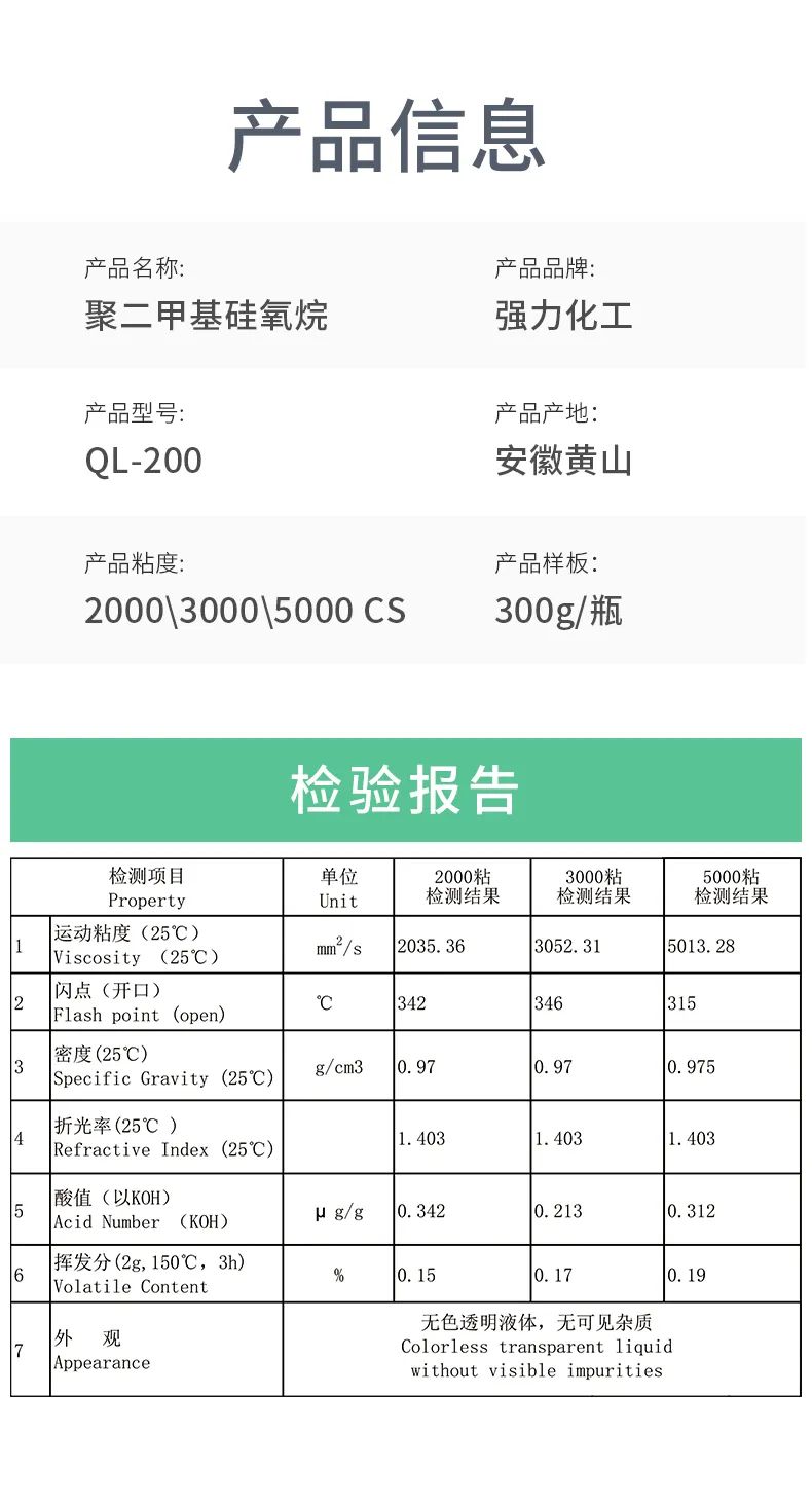 強力化工不斷升級建設,為了響應新老顧客的需求與要求,公司決定新增三個牌號201硅油,分別是QL-200 DM2000、QL-200 DM3000,QL-200 DM5000。品質過硬,價格實惠,歡迎聯(lián)系咨詢。