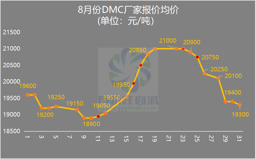 金九銀十的首發(fā)之日,有機(jī)硅仍處在上下游博弈階段,DMC在8月先跌后漲再走跌,價格走勢呈倒N字形。8月行情基本可以分三個階段:上旬,難敵需求施壓,龍頭單體廠DMC跌至18800元/噸,隨即封盤拉漲,刺激一波下游抄底備貨。中旬受原料金屬硅大漲提振,國內(nèi)單體廠借勢延續(xù)拉漲,DMC在8月19日沖至21000元/噸;臨近月末,終端需求持續(xù)萎縮,市場避險情緒再起,同時金屬硅也重啟連跌模式,DMC又回到月初低點(diǎn),截止31日 ,山東單體廠DMC跌至18800元/噸。今日9月1日,持穩(wěn)開盤!