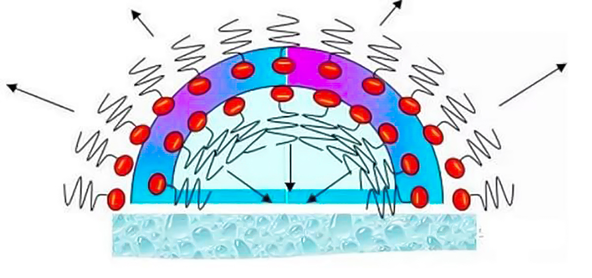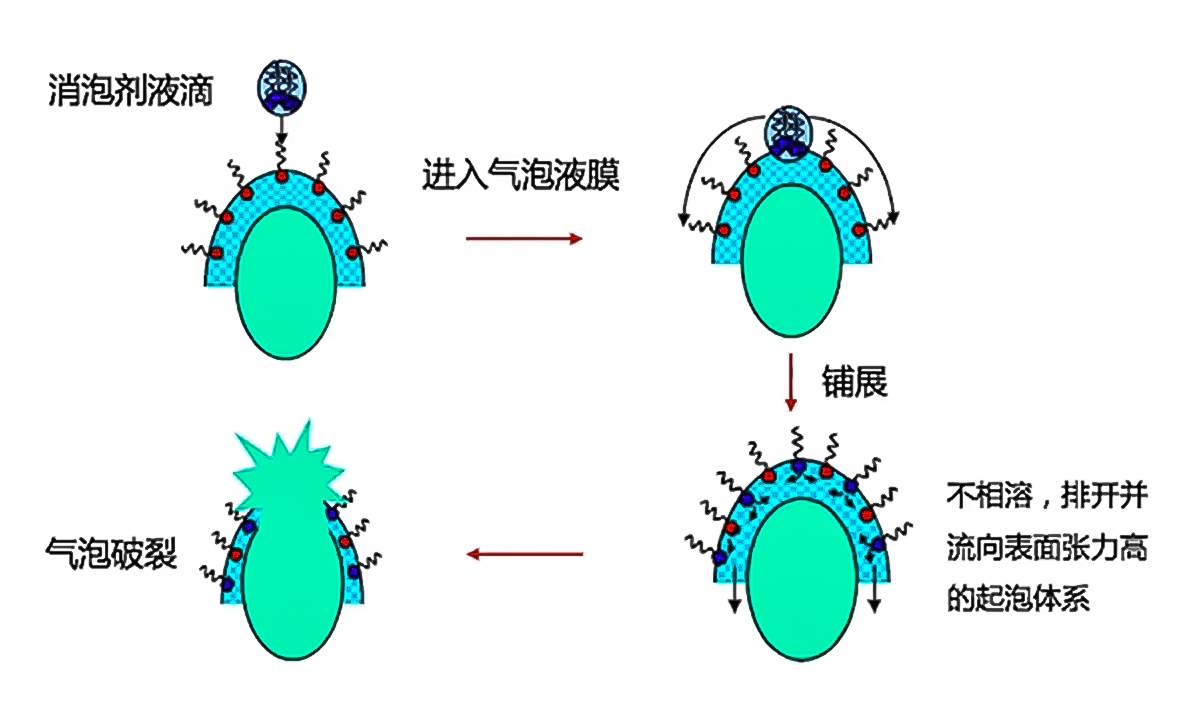 分散均勻的消泡劑滲透進(jìn)入泡沫薄層并且形成單分子膜,使其附著力降低,易于薄層破裂。