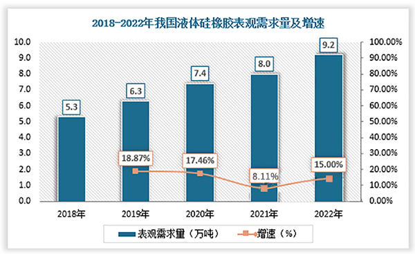 根據(jù)觀研報(bào)告網(wǎng)發(fā)布的《中國(guó)液體硅橡膠行業(yè)現(xiàn)狀深度分析與投資趨勢(shì)研究報(bào)告(2023-2030年)》顯示,液體硅橡膠由于耐熱耐候、無毒、電氣絕緣、生物相容性、無色透明、抗撕裂等諸多優(yōu)點(diǎn)而在醫(yī)用、電子電氣、食品母嬰等行業(yè)有廣泛應(yīng)用。液態(tài)硅橡膠因其獨(dú)特的性能而成為非??量虘?yīng)用的理想材料,近年來需求量持續(xù)增長(zhǎng)。據(jù)數(shù)據(jù),2021年我國(guó)液體硅橡膠表觀需求量為8萬噸,較上年同比增長(zhǎng)8.11%;2022年我國(guó)液體硅橡膠表觀需求量為9.2萬噸,較上年同比增長(zhǎng)15.00%。
