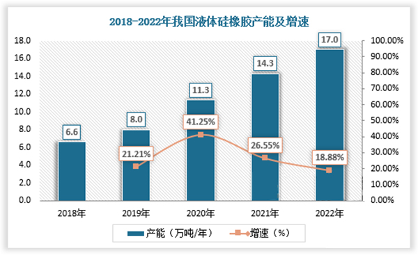 全球發(fā)達(dá)國(guó)家于20世紀(jì)70年代末期開始研究液體硅橡膠技術(shù),到80年代末期開始工業(yè)化生產(chǎn),與此同時(shí),我國(guó)液體硅橡膠研究工作起步,至90年代末、21世紀(jì)初我國(guó)液體硅橡膠進(jìn)入工業(yè)化生產(chǎn)階段。與發(fā)達(dá)國(guó)家相比,我國(guó)液體硅橡膠行業(yè)起步較晚,但發(fā)展迅速,現(xiàn)階段我國(guó)已經(jīng)成為全球液體硅橡膠生產(chǎn)大國(guó)。數(shù)據(jù)顯示,2022年我國(guó)液體硅橡膠產(chǎn)能達(dá)約17萬噸/年,產(chǎn)量達(dá)約11.3萬噸。