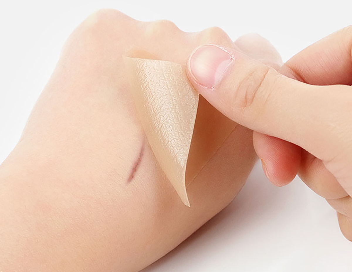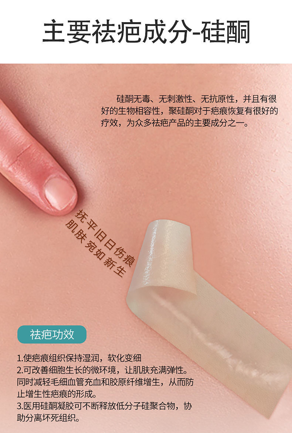 硅膠片,透明柔軟但不透水,對皮膚有粘性,能夠讓疤痕保持一定程度的溫度濕度、壓力、氧氣量等,以軟化疤痕,預防疤痕增生,最后達到減淡疤痕的效果。