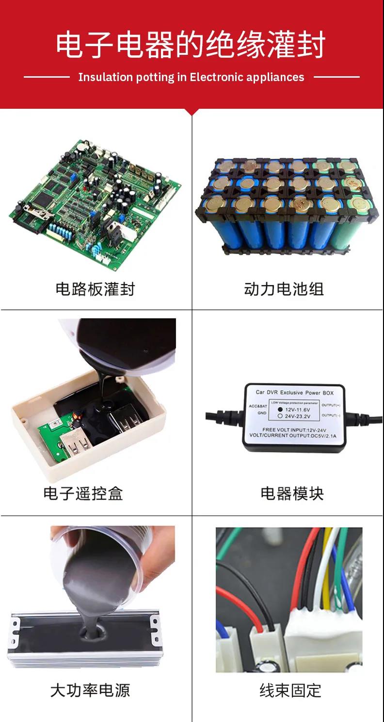 電子產(chǎn)品在制造完成之后,往往需要再進(jìn)行―道灌封工藝,使其與外界隔絕,以此提高電子產(chǎn)品的抗震能力、防水性能,防止電子元器件受到自然環(huán)境的侵蝕,延長(zhǎng)電子產(chǎn)品的使用壽命。目前用于灌注在電子元器件內(nèi)的灌封材料多種多樣,使用較多主要還是:聚氨酯材質(zhì)、環(huán)氧樹脂材質(zhì)和有機(jī)硅材質(zhì)。其中使用最多的還是有機(jī)硅材質(zhì)的灌封膠,因各種優(yōu)良的特性而被廣泛應(yīng)用。