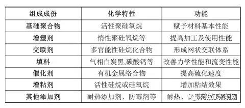 縮合反應(yīng)型硅膠,一般是以端羥基聚硅氧烷為基礎(chǔ)聚合物,多官能硅烷或硅氧烷為交聯(lián)劑,在催化劑作用下,室溫下遇水汽或混勻即可發(fā)生縮合反應(yīng),形成三維網(wǎng)絡(luò)彈性體??s合反應(yīng)型硅膠的基本組成及化學(xué)功能如下所示。