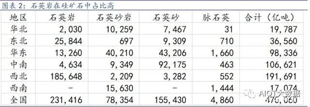 工業(yè)硅的上游原料是硅礦石,自然界的石英巖、石英砂、石英砂巖、脈石英等硅質(zhì)原料統(tǒng)稱 為硅礦石,生產(chǎn)工業(yè)硅的原材料主要是石英巖。從中國硅礦石資源類型看,石英巖查明資源儲量 23.1 億噸,占比 49%,主要分布在青海和陜西;石英砂儲量 15.5 億噸,占比 33%;石英砂巖儲 量 7.8 億噸,占比 17%;脈石英儲量 0.5 億噸,占比 1%。